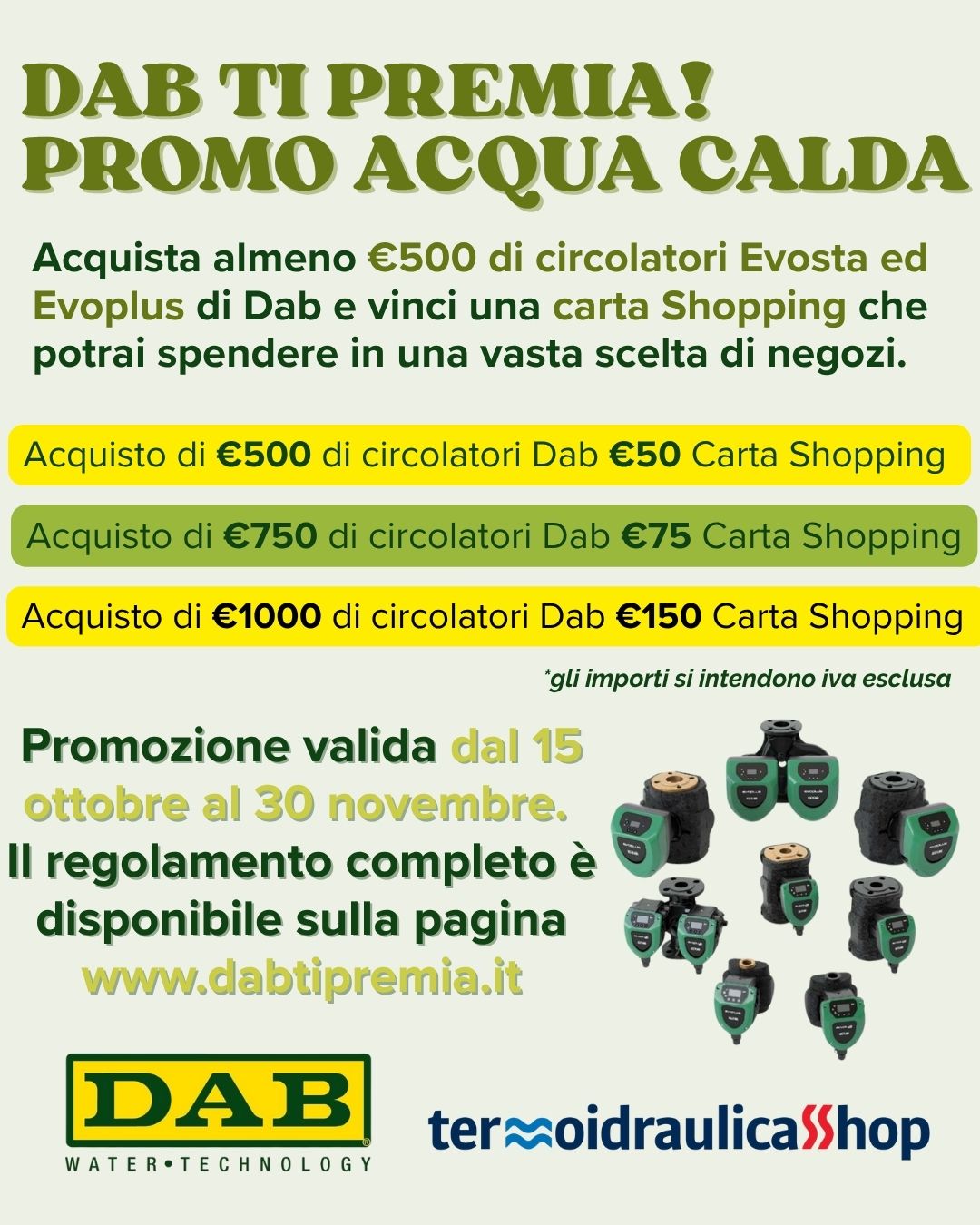 Acquista almeno €500 di circolatori Evosta ed Evoplus di Dab e vinci una carta Shopping che potrai spendere in una vasta scelta di negozi.